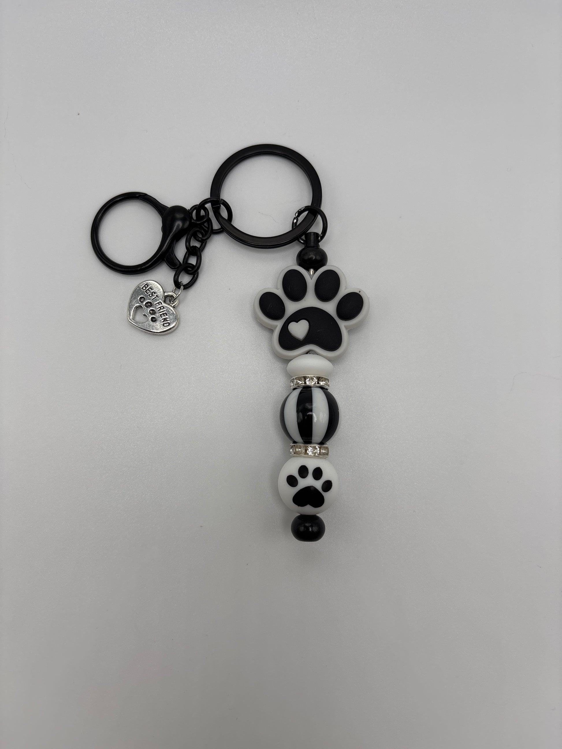 Black & White Paw Print Keychain with Stripe Bead – Cute Pet Lover Gift - Dog Mom Accessory