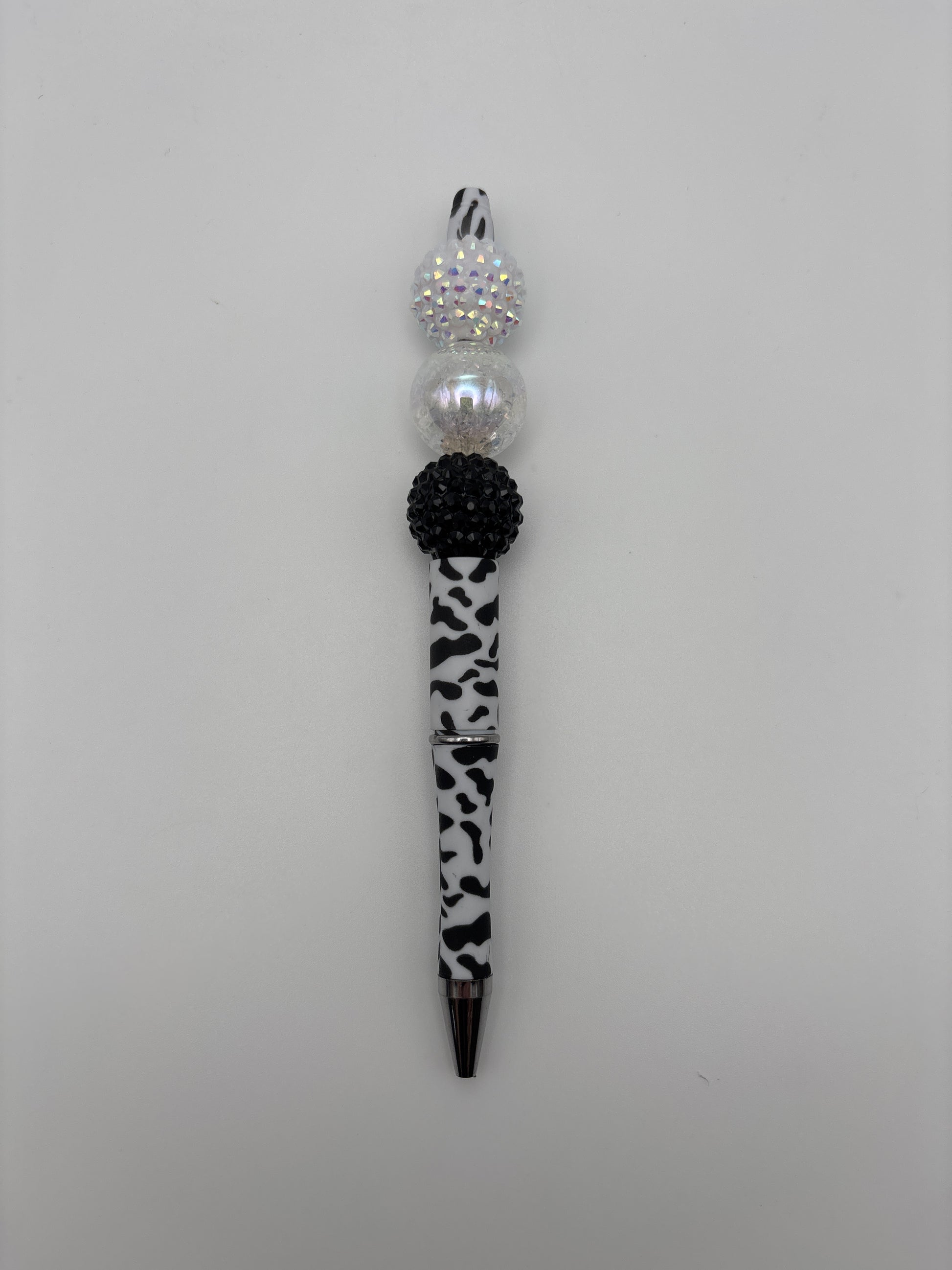 Add a touch of glam to your day with this Black & White Sparkle Animal Print Beaded Pen!