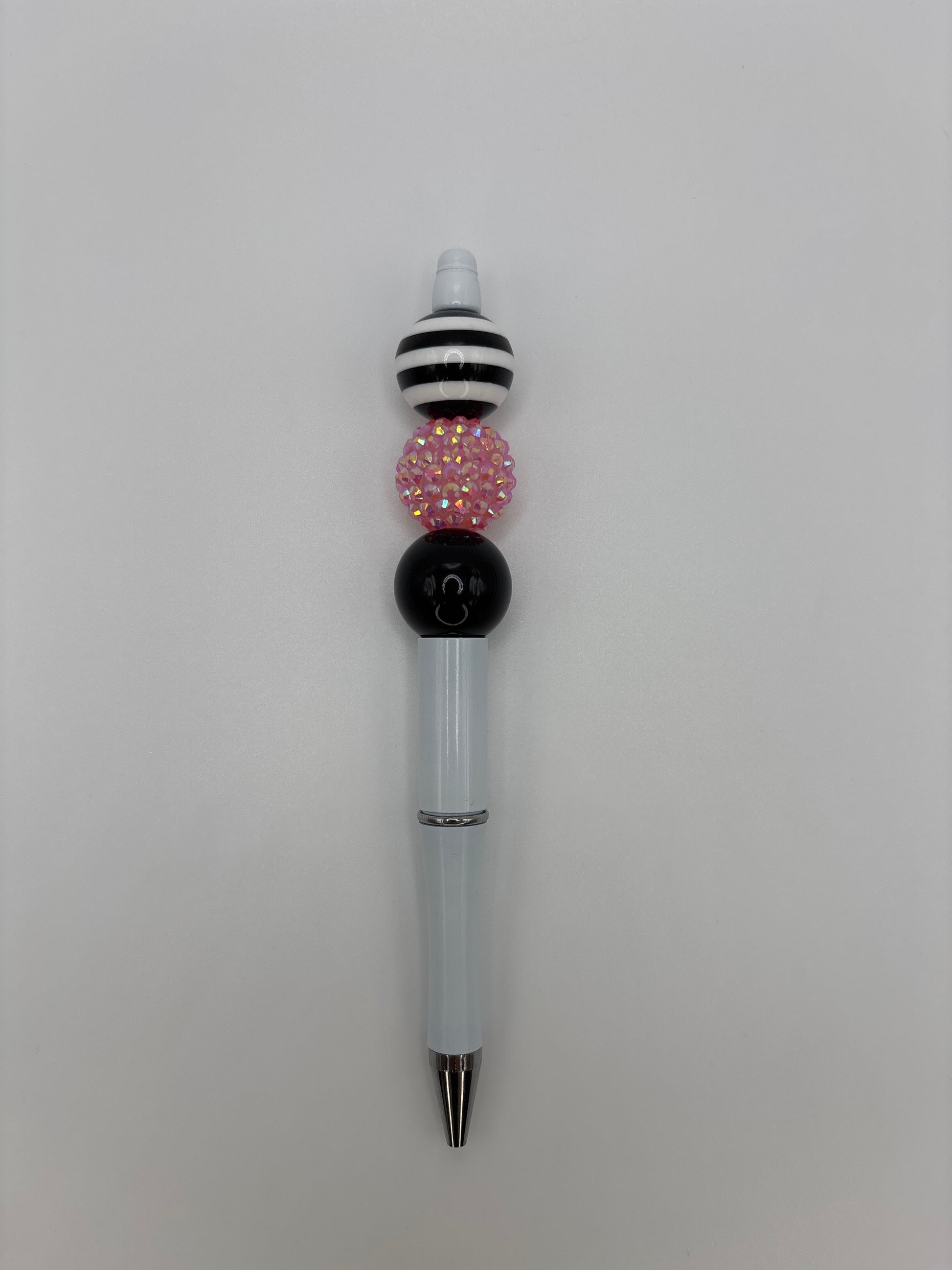 Add a pop of glam to your writing with this Black & White Striped Beaded Pen, featuring a sleek white barrel, a sparkling pink crystal bead, glossy black bead, and a bold black-and-white striped top bead. This pen is handmade, refillable, and writes as beautifully as it looks — perfect for journaling, planners, or gifting.