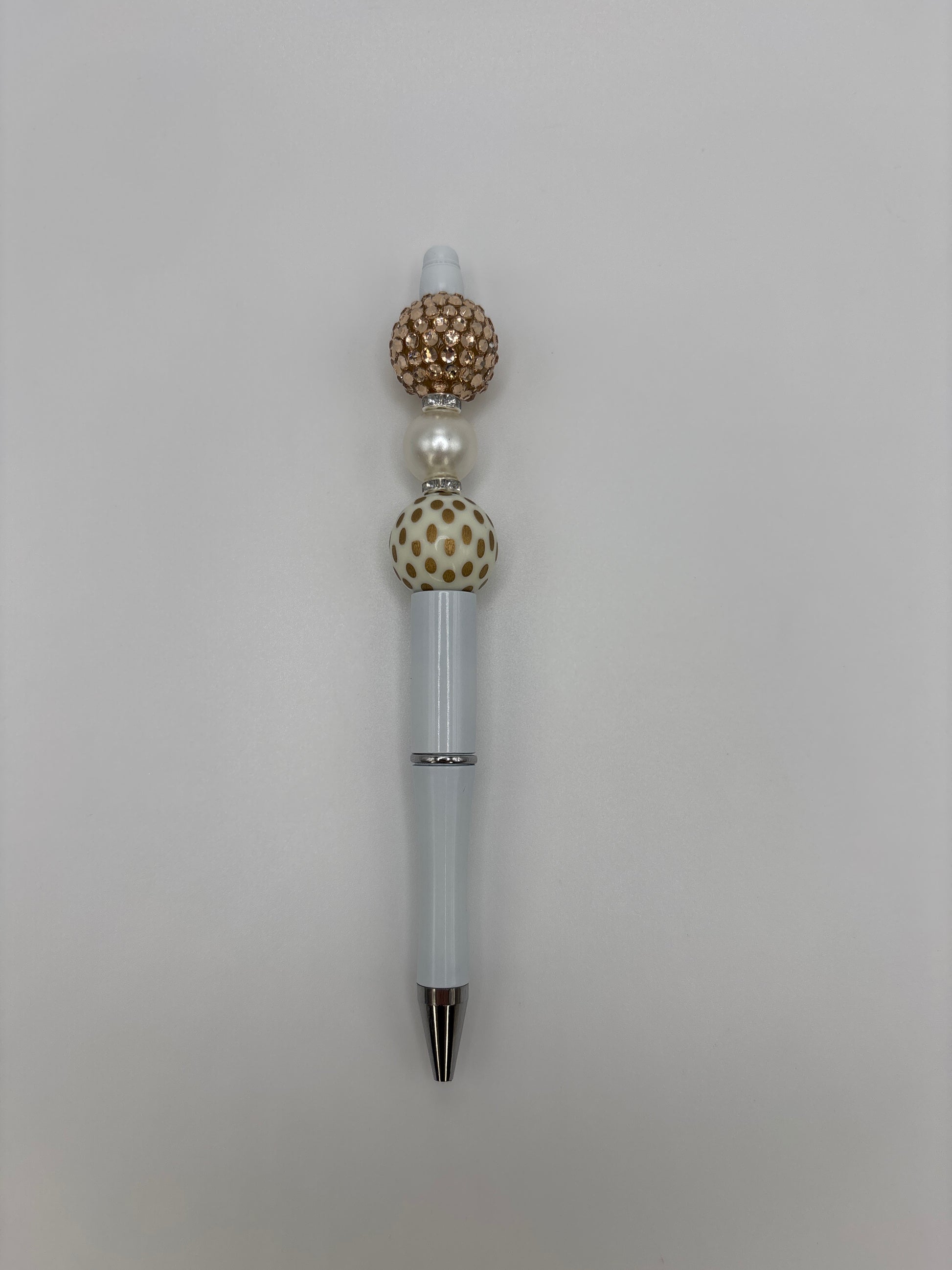 The Champagne Pearl Glam Pen brings soft elegance with a playful twist. It features a glossy white barrel, shimmering gold rhinestone bead, lustrous pearl bead, and a chic gold polka-dot accent bead. This refillable handmade pen adds a luxurious sparkle to your desk — perfect for journaling, gifting, or everyday glam.