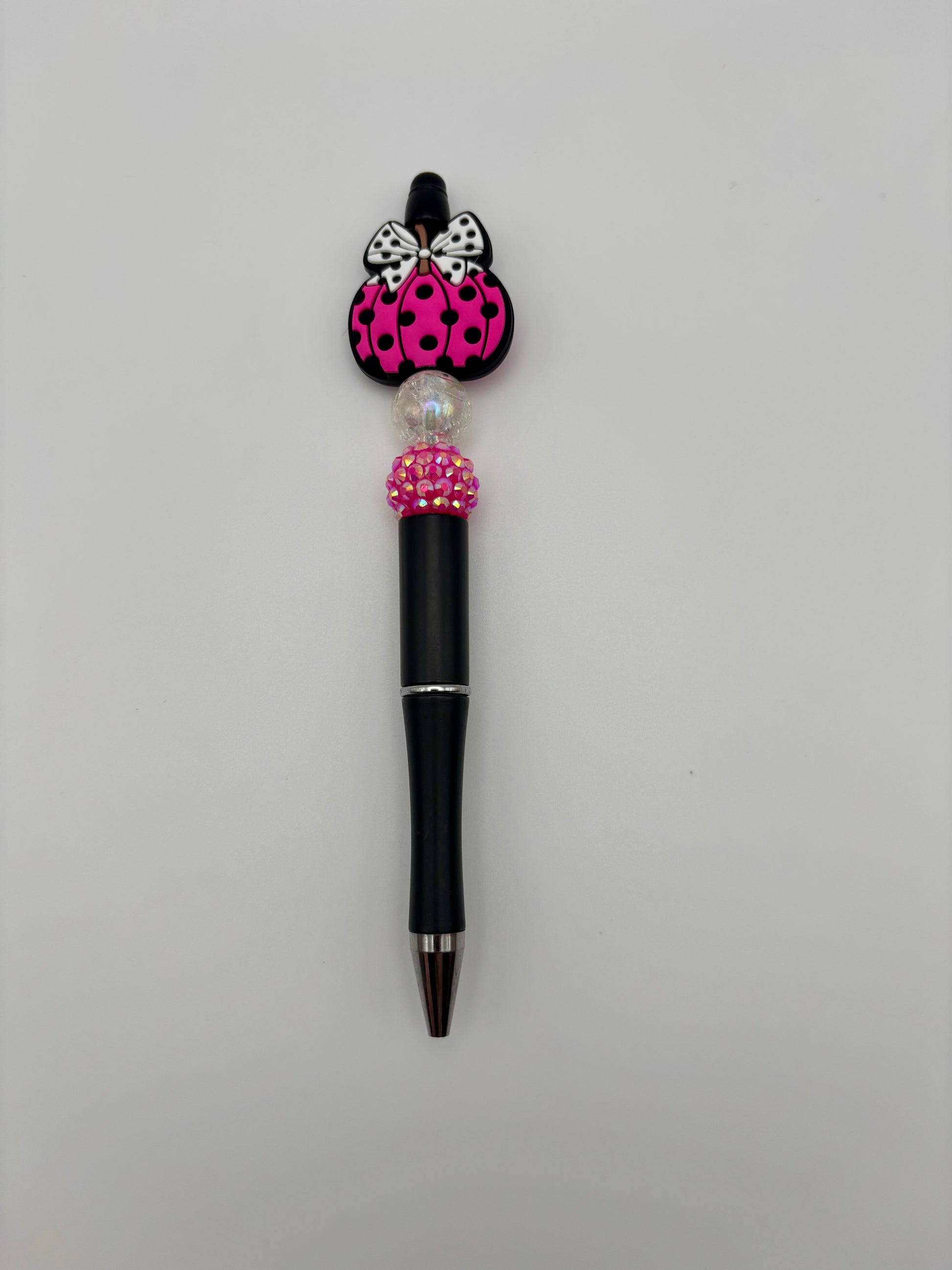 Bold and playful, this hot pink pumpkin beaded pen is made for Halloween fun. Featuring a bright pumpkin charm with polka dots, a crystal and accent beads, and smooth black ink, it’s perfect for adding a splash of color to your stationery collection. Whether used at work, school, or as a seasonal gift, this pen is both functional and festive. A unique way to celebrate spooky season in style.