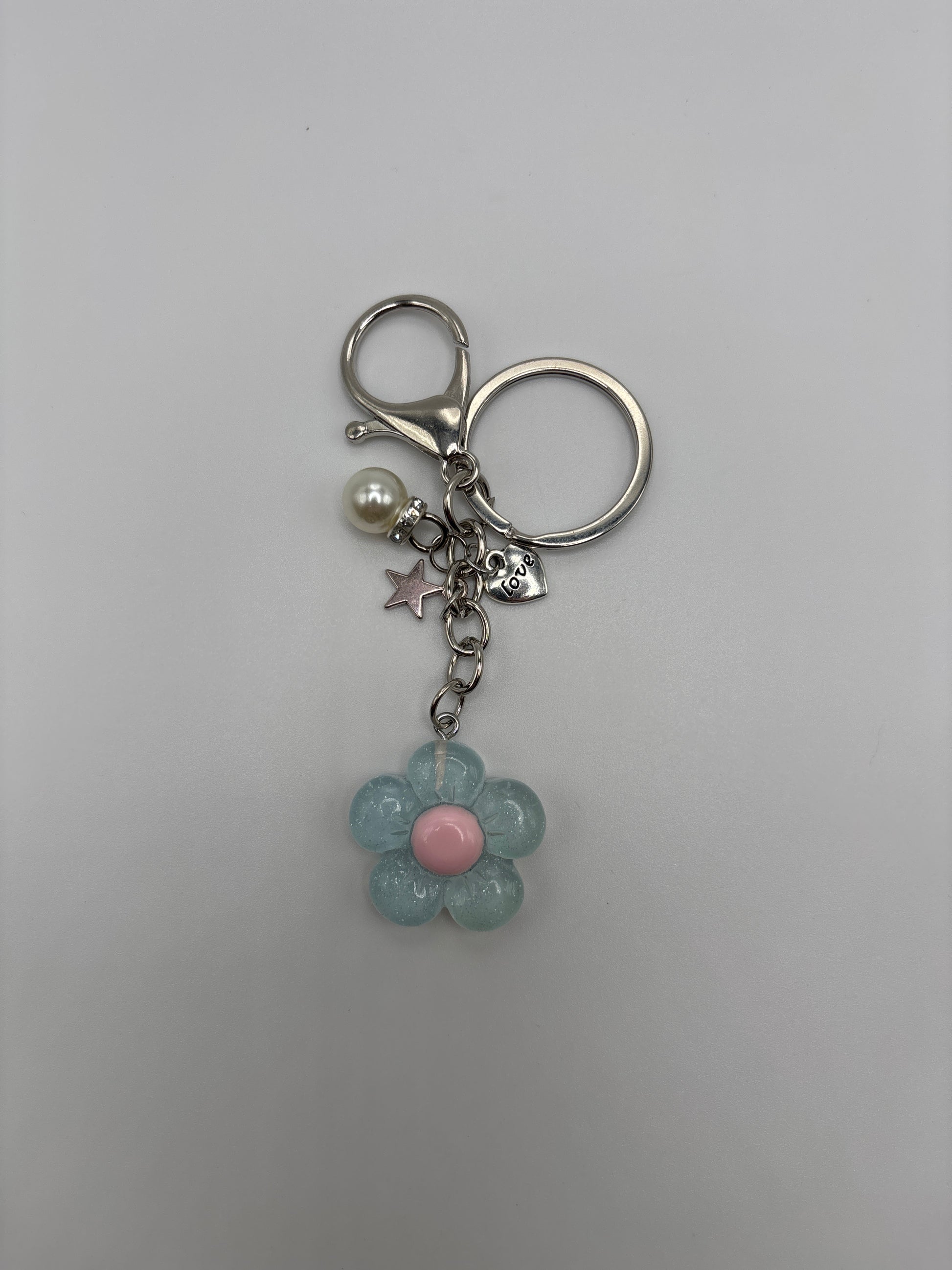 Add a touch of sweetness to your day with these pastel daisy keychains! This keychain features a glossy acrylic flower charm in pastel blue with pink center accented with a tiny pearl, star and love charm for that perfect Beads & Glimmer sparkle.