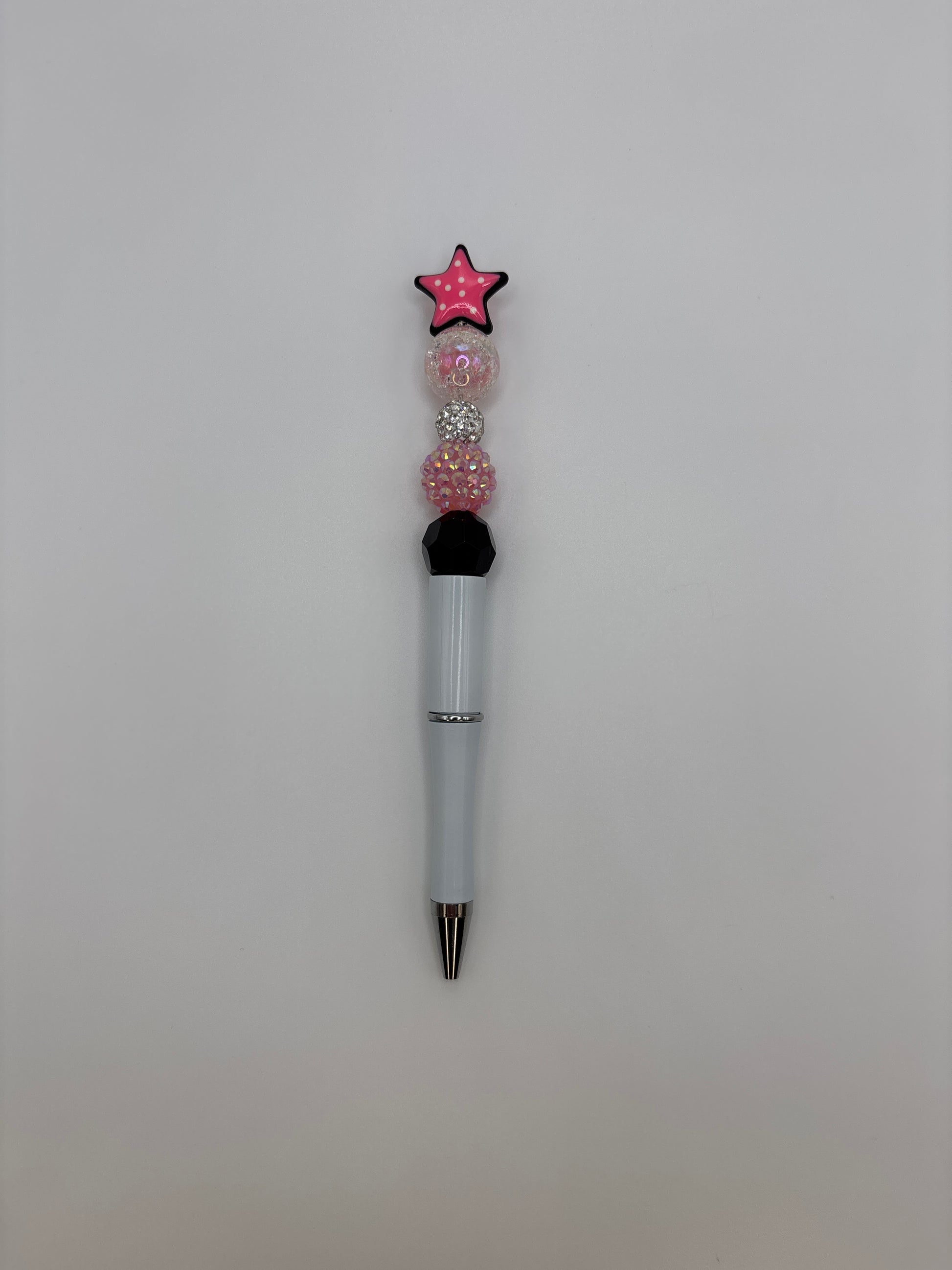 Pink Star Topper Sparkly Beaded Pen with White Barrel and Black Bead