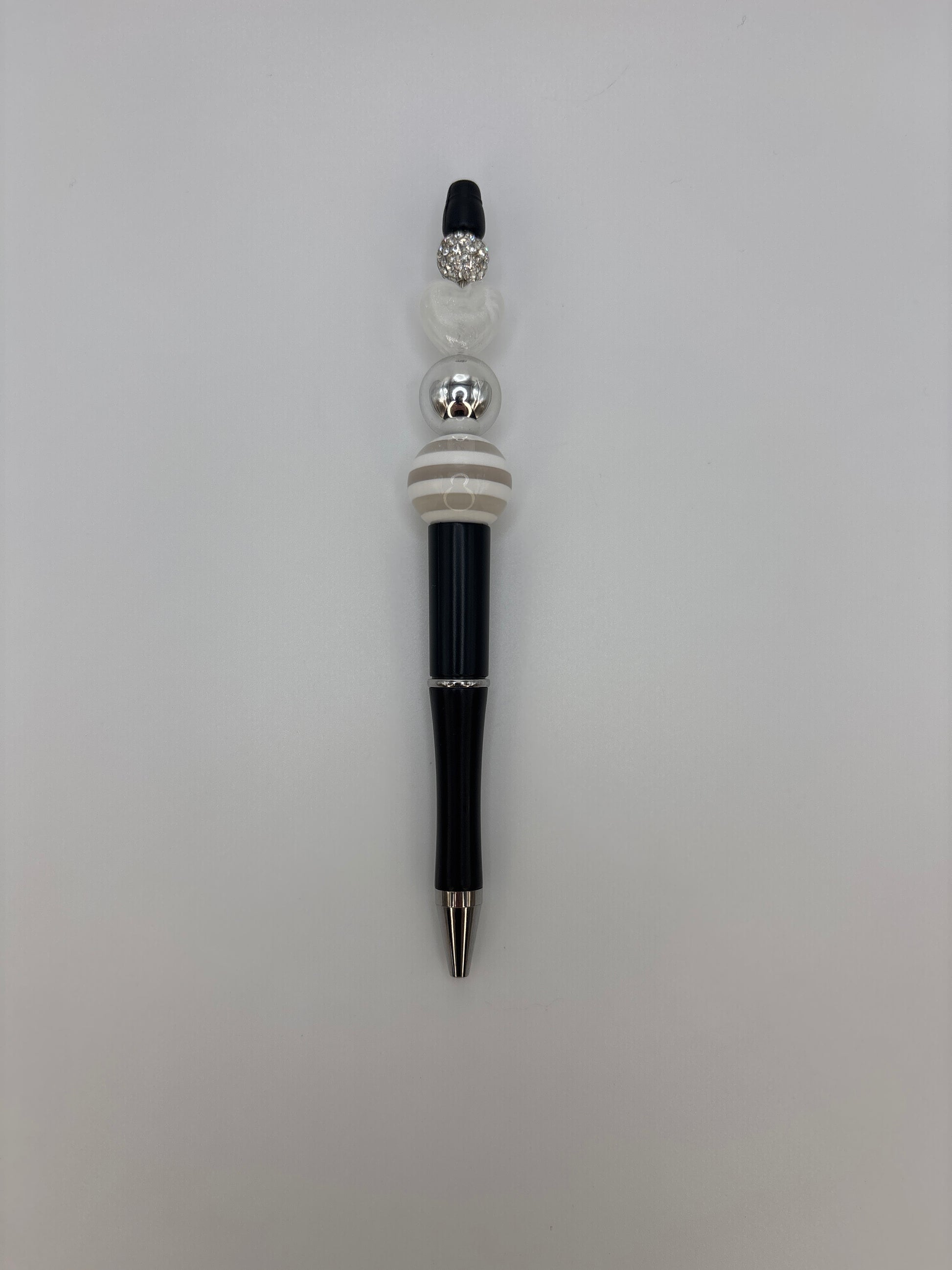 Featuring a black barrel with shimmering rhinestone, heart, silver, and striped beads, this pen is designed to turn everyday writing into something beautiful. Handmade with love and polished to perfection, it makes a thoughtful gift for any occasion.